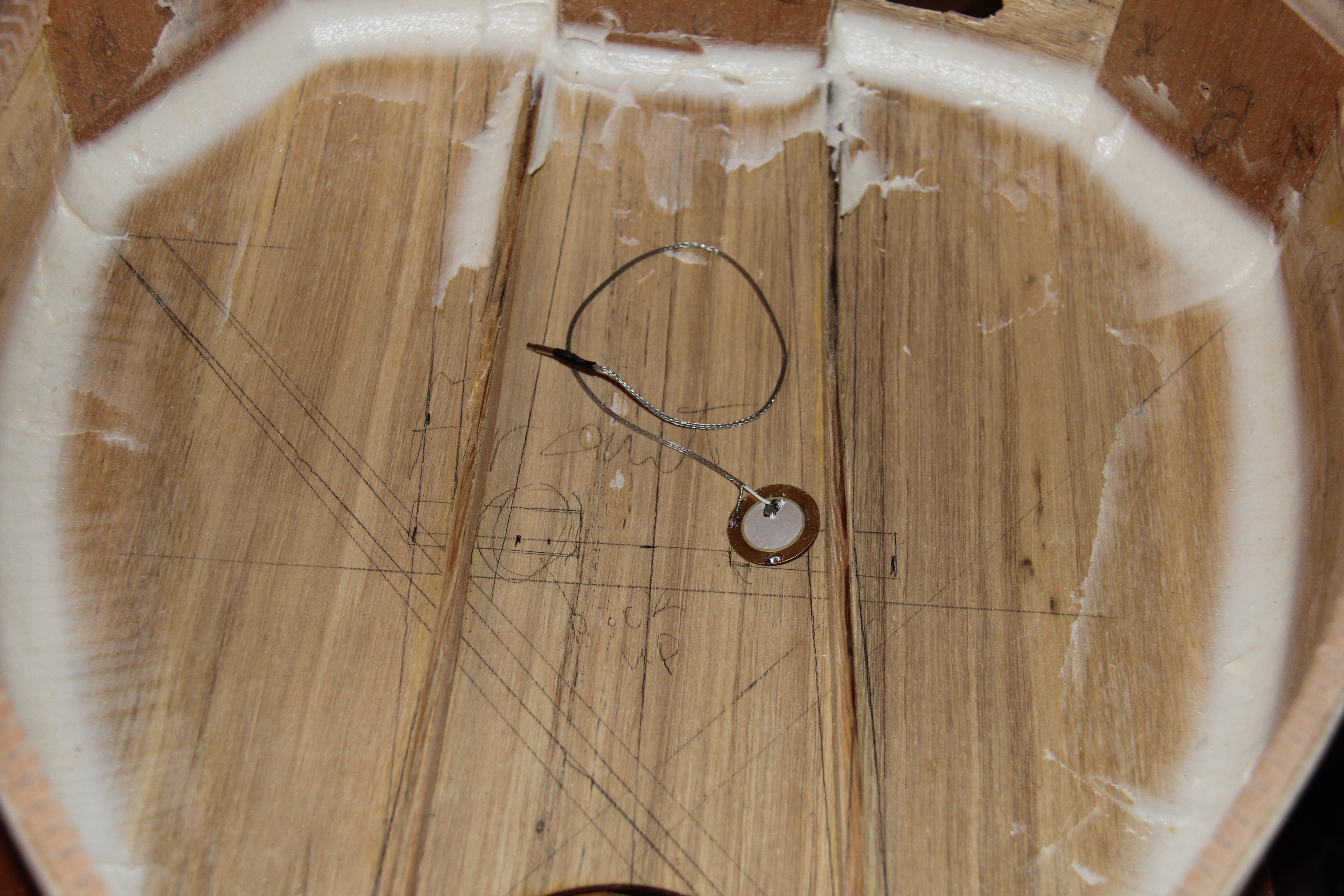 I also put the pickup in. The dollar sized bit is the pickup the L shaped bit in the bag is the one I cut off. Here I have everything wired for testing (works fine). Then here is where it will go, I have found under the bass string works best. Maybe one on this side too? (they were 10 for $5)